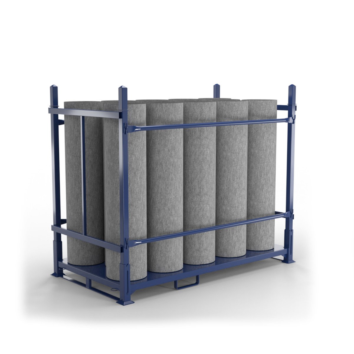 Un pallet in acciaio resistente e funzionale, progettato per lo stoccaggio e il trasporto di merci con dimensioni non standard. Ha una capacità di carico di 1000 kg e permette l’impilamento fino a 3 livelli, raggiungendo un’altezza di quasi 7 metri. La struttura è dotata di barre di bloccaggio che assicurano il carico durante il trasporto.